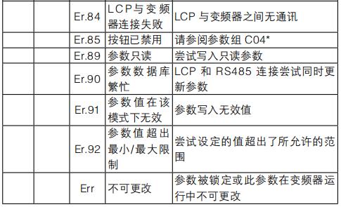 錯誤說明變頻器正存在某種狀態(tài),而無法進行某項操作。錯誤產(chǎn)生時,面板顯示“Er.XX”(XX指數(shù)字)。
