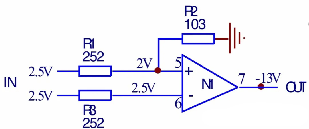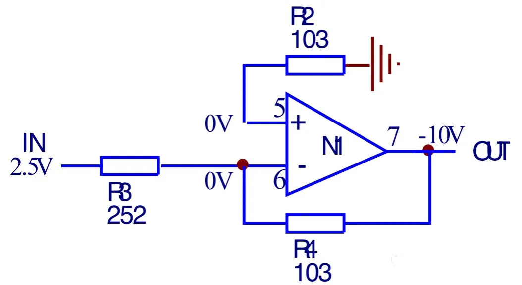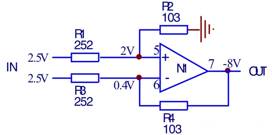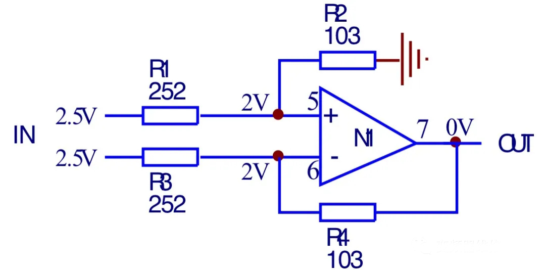 故障現(xiàn)象同上。測5腳為0V,6腳為0V,7腳為-10V。1、放大器的“虛短”和反相放大器的“虛地”規(guī)則仍然成立,N1芯片是好的。2、進(jìn)一步分析,此時差分放大器變身為反相放大器,如圖4所示。判斷故障為R1斷路或虛焊,引起同相輸入端的輸入信號電壓丟失,而反相輸入端的2.5V被四倍反相放大。查R1有虛焊現(xiàn)象,補(bǔ)焊后故障排除。