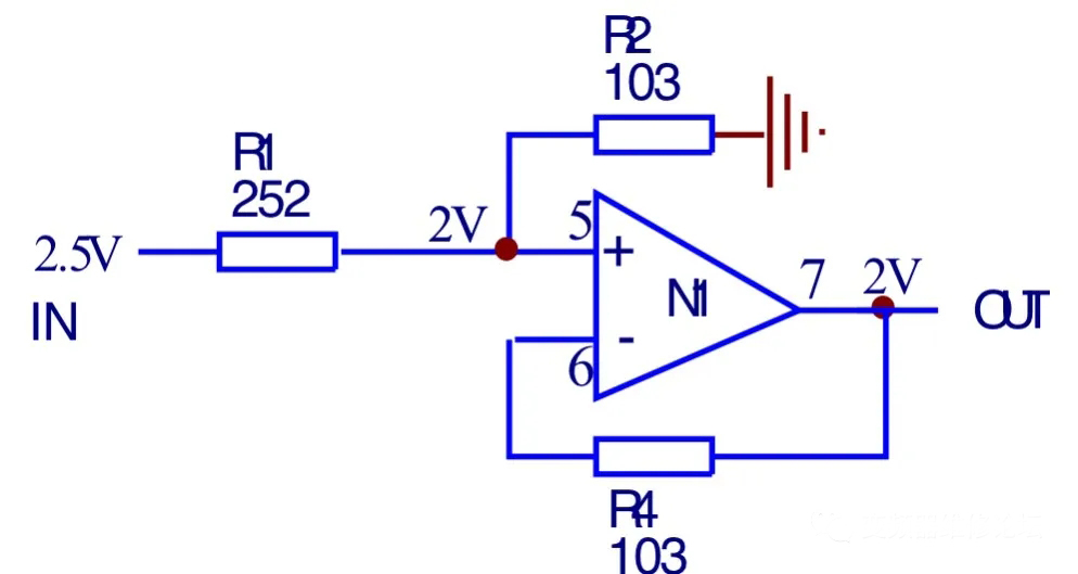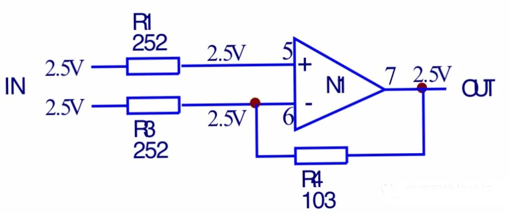 故障現(xiàn)象同上。測5、6、7腳均為2.5V。1、放大器的“虛短”規(guī)則仍然成立,N1芯片是好的。2、進(jìn)一步分析,此時由于同相輸入端的分壓電路異常,導(dǎo)致原差分放大器的“輸出虛地”條件被破壞,如圖5所示。故使輸出電壓由0V上升為2.5V。判斷故障為R2斷路或虛焊,引起同相輸入端的輸入電壓上升。測量確如判斷,代換R2后N1輸出正常。