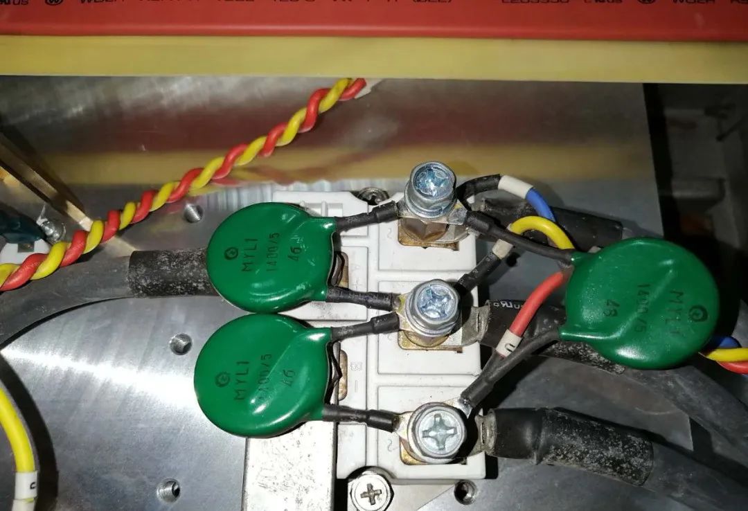 4.壓敏電阻   壓敏電阻是一種具有非線性伏安特性的電阻器元件,當(dāng)加在壓敏電阻上的電壓低于它的閾值時(shí),流過(guò)它的電流極小,它相當(dāng)于一個(gè)阻值無(wú)窮大的電阻;當(dāng)加在壓敏電阻上的電壓超過(guò)它的閾值時(shí),流過(guò)它的電流激增,它相當(dāng)于阻值無(wú)窮小的電阻,利用壓敏電阻的特性,用于在電路承受過(guò)電壓時(shí)進(jìn)行電壓鉗位,吸收多余的電流以保護(hù)敏感器件和后續(xù)電路。我個(gè)人理解是當(dāng)電路中的過(guò)電壓使壓敏電阻導(dǎo)通后,功率單元的輸入側(cè)相間短路,熔斷器熔斷,保護(hù)后續(xù)電氣回路。檢測(cè)時(shí)使用萬(wàn)用表電阻檔位測(cè)量整流橋并聯(lián)壓敏電阻。