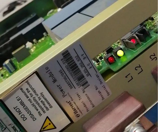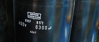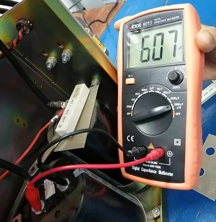 額定容量是6300μF,測(cè)得6070μF,只要不低于額定容量的80%就是合格的,注意電解電容是有極性的,有白色圖標(biāo)的一側(cè)為負(fù)。一個(gè)功率單元濾波回路是三個(gè)電容器串接而成的,串聯(lián)電容總?cè)萘康扔诿總(gè)電容器容量的倒數(shù)和的倒數(shù)。所以我們測(cè)總?cè)萘渴?020μF。