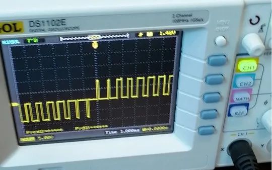 調(diào)整示波器水平方向旋鈕,波形壓縮之后變成下圖的標(biāo)準(zhǔn)方波。