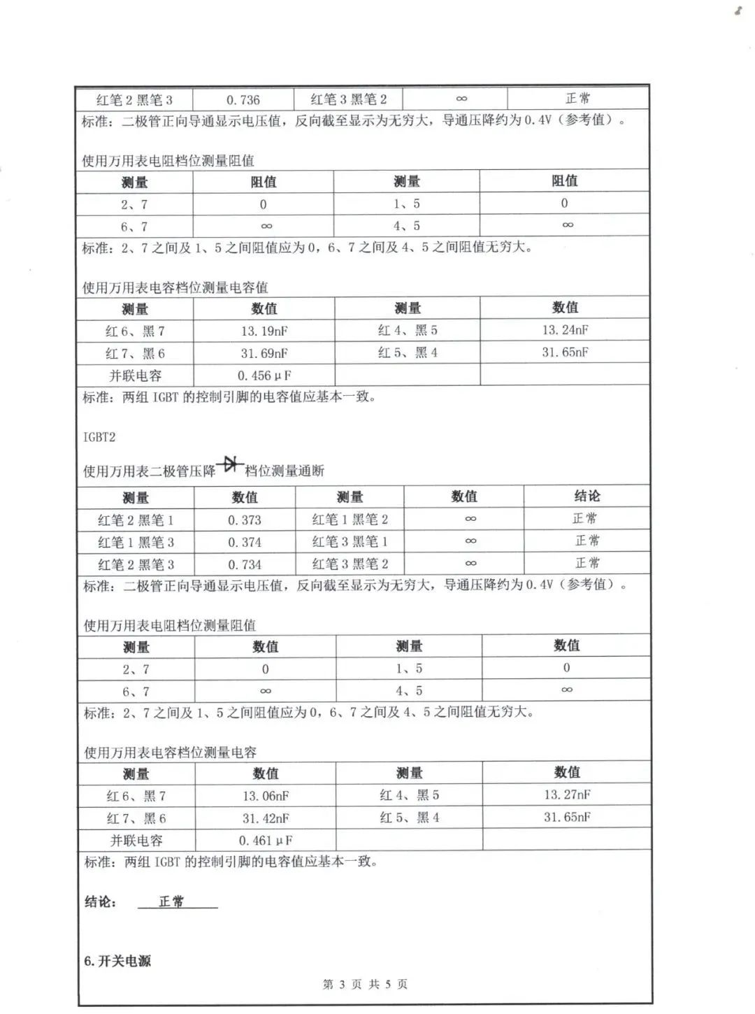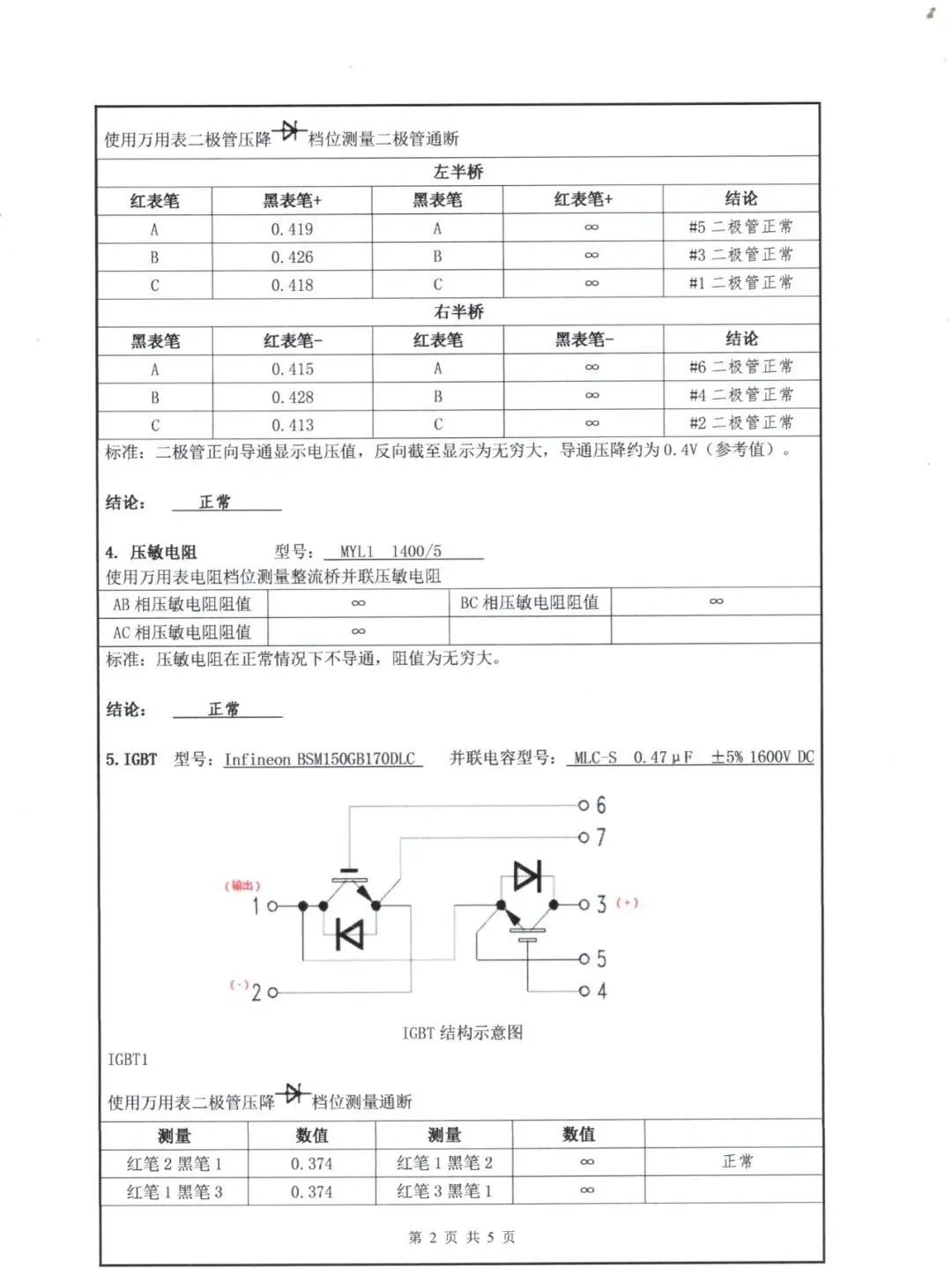 5. IGBT模塊  AB變頻器功率單元內(nèi)都是使用的德國(guó)英飛凌的IGBT,IGBT的英文全稱是Insulated Gate Bipolar Transistor,中文名稱是絕緣柵雙極型晶體管。具體檢測(cè)步驟及標(biāo)準(zhǔn)詳見檢測(cè)報(bào)告單。