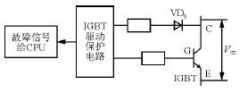 代碼ER15 表示逆變模塊IPM、IGBT故障,主要原因?yàn)檩敵鰧?duì)地短路、變頻器至電動(dòng)機(jī)的電纜線過(guò)長(zhǎng)(超過(guò)50 m)、逆變模塊或其保護(hù)電路故障,F(xiàn)場(chǎng)處理時(shí)先拆去電動(dòng)機(jī)接線,測(cè)量變頻器逆變模塊,觀察輸出是否存在短路,同時(shí)檢查電動(dòng)機(jī)是否對(duì)地短路及電動(dòng)機(jī)接線是否超過(guò)允許范圍,如上述均正常,則可能為變頻器內(nèi)部IGBT 模塊驅(qū)動(dòng)或保護(hù)電路異常。一般IGBT過(guò)電流保護(hù)是通過(guò)檢測(cè)IGBT導(dǎo)通時(shí)的管壓降動(dòng)作的,如圖6所示。