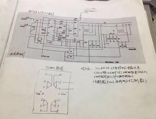 此故障有點(diǎn)意思,沒有驅(qū)動(dòng)脈沖為什么會(huì)有+電壓產(chǎn)生,難道是驅(qū)動(dòng)光耦已經(jīng)工作了,查看電路圖,將陶瓷片的1和2腳短路,發(fā)現(xiàn)電壓馬上回到正確的-5.4V,到此說明陶瓷片工作正常,那為什么驅(qū)動(dòng)光耦在沒有脈沖的情況下會(huì)導(dǎo)通工作呢?看下圖:
