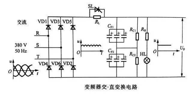 在SPWM變頻器中大多采用橋式全波整流電路,在中、小容量的變頻器中整流器件采用不可控的整流二極管或二極管模塊,如下圖所示變頻器交-直變換電路中的VD1~ VD6。當(dāng)三相線電壓為380V時,整流后的峰值電壓為537V,平均電壓為515V。