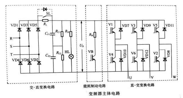 不同系列交-直-交變頻器內(nèi)部的主體電路基本相同,變頻調(diào)速過程中出現(xiàn)的許多現(xiàn)象都可通過主體電路來進行分析。
