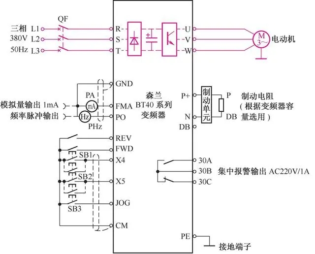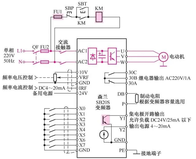 目前變頻器作為新穎的電氣設(shè)備, 在實(shí)際工作中得到了廣泛應(yīng)用, VFD-007V23A變頻器接線線路就是實(shí)際應(yīng)用線路之一, 如圖4-3所示。