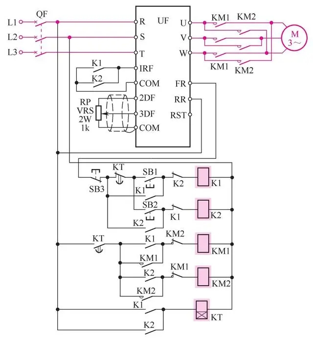 欲使M反轉(zhuǎn), 在IRF-COM接通后, 變頻器UF開(kāi)始運(yùn)行, 其輸出頻率按預(yù)置的升速時(shí)間上升至給定的相對(duì)應(yīng)數(shù)值。 當(dāng)按下停止按鈕SB3后, K1失電釋放, IRF-COM斷開(kāi), 變頻器UF輸出頻率按預(yù)置頻率下降至0, M停轉(zhuǎn)。 按下反轉(zhuǎn)按鈕SB2, 則反轉(zhuǎn)繼電器K2得電吸合, 使接觸器KM2吸合, 電動(dòng)機(jī)反轉(zhuǎn)運(yùn)行。