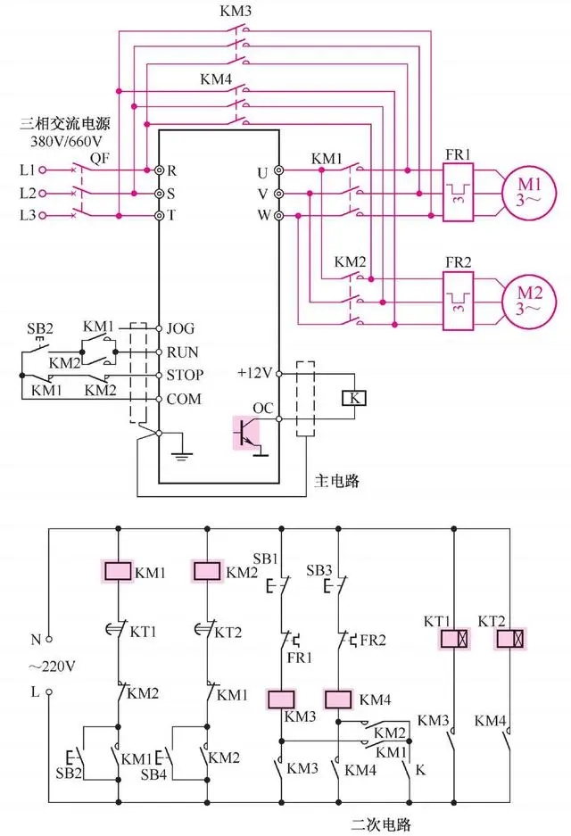 按下二次電路中的SB1、 SB3則M1、 M2停止運(yùn)行。