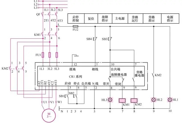 CR1-30~CR1-450電動(dòng)機(jī)軟啟動(dòng)器線路如圖4-11所示。 圖中QF為斷路器;FU1為快速熔斷器;KM1、 KM2為交流接觸器, 其中KM2為旁路接觸器;SB1為啟動(dòng)按鈕, SB2為軟停按鈕, SB3為電動(dòng)機(jī)急停按鈕, SB4為控制電源復(fù)位按鈕;HL1為電源指示燈, HL2為旁路指示燈, HL3為故障指示燈。