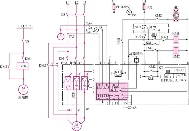 BCK箔式繞組磁控式電動(dòng)機(jī)軟啟動(dòng)器是一種交流異步電動(dòng)機(jī)軟啟動(dòng)裝置, 可減輕電動(dòng)機(jī)啟動(dòng)時(shí)對(duì)電網(wǎng)的沖擊擾動(dòng), 降低對(duì)電網(wǎng)容量的要求。 它采用繼電器、 可編程序控制器 (PLC) 或單片機(jī)控制系統(tǒng),實(shí)現(xiàn)對(duì)異步電動(dòng)機(jī)啟動(dòng)過(guò)程和運(yùn)行方式的手動(dòng)與自動(dòng)集中和就地控制,具有低耗節(jié)能、 適應(yīng)重載啟動(dòng)等優(yōu)點(diǎn)。 BCK箔式繞組磁控式電動(dòng)機(jī)軟啟動(dòng)器線路如圖4-10所示。