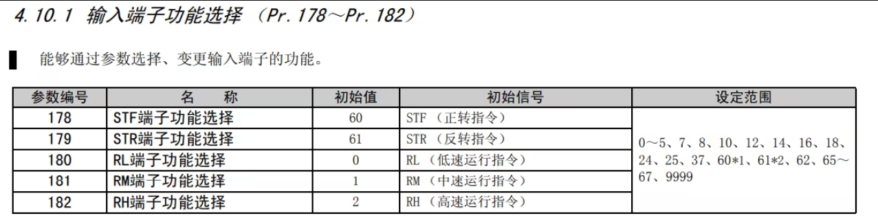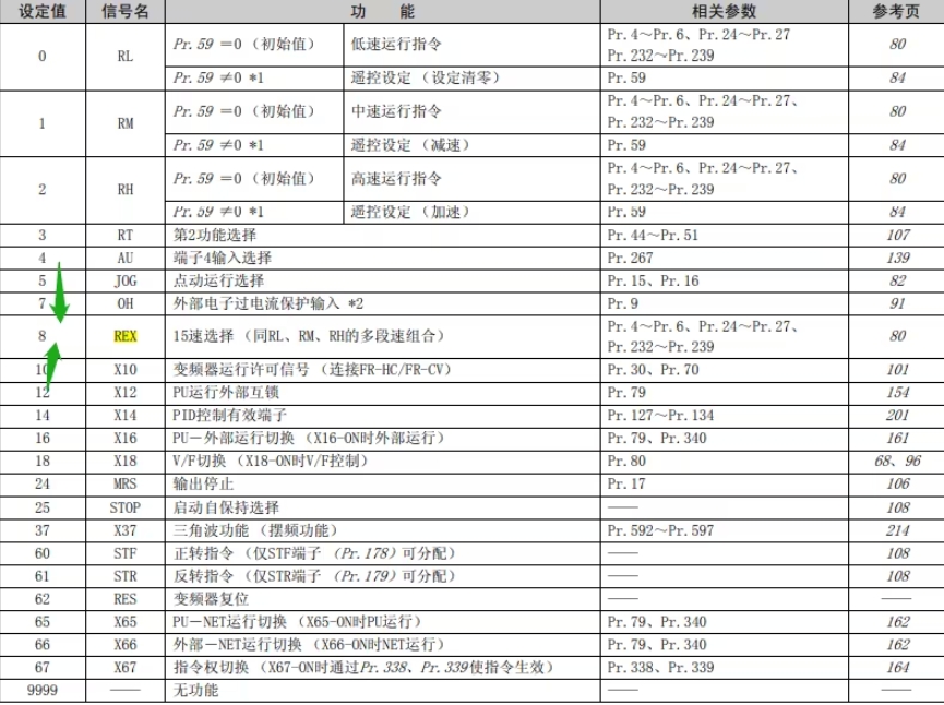 第一步:15段速要使用4個(gè)端子作為信號(hào),所以必須要更改STR,STF其中一個(gè)端子作為調(diào)速的信號(hào),我們稱這個(gè)虛擬端子為REX,找到Pr.178~Pr.182參數(shù)型號(hào),這里選擇修改STR端子。找到Pr.179參數(shù),進(jìn)入后參數(shù)設(shè)置為 "8" 。PS:有些變頻器在Pr.160在往上調(diào)就回到了起點(diǎn),沒有后面的參數(shù)號(hào),這里可以把Pr.160里面的參數(shù)改為“0”即可(初始值9999)。