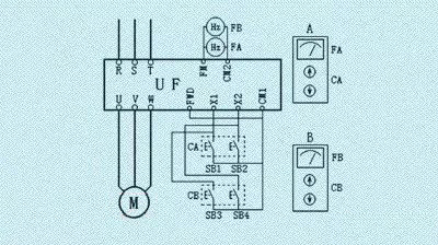 如圖5所示,SB1和SB2是一組升速和降速按鈕,安裝在控制盒CA內(nèi),由“頻率表”FA顯示其運(yùn)行頻率;SB3和SB4是另一組升速和降速按鈕,安裝在另一個(gè)控制盒CB內(nèi),由“頻率表”FB顯示其運(yùn)行頻率?刂坪蠧A和CB分別放置在兩個(gè)不同的地方。