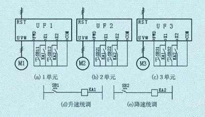 按下SB1,繼電器KA1得電,其觸點(diǎn)分別將各變頻器的X1-COM接通,各單元電動(dòng)機(jī)同時(shí)升速;