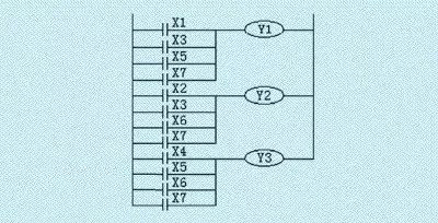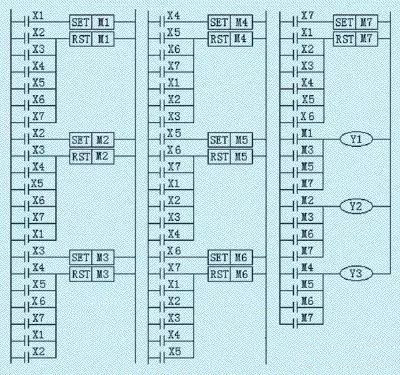 M1、M3、M5、M7中只要有一個(gè)接通,則Y1“動(dòng)作”→變頻器的S1端接通; M2、M3、M6、M7中只要有一個(gè)接通,則Y2“動(dòng)作”→變頻器的S2端接通; M4、M5、M6、M7中只要有一個(gè)接通,則Y3“動(dòng)作”→變頻器的S3端接通。