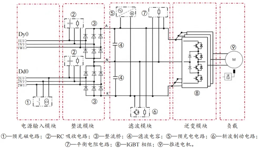 該變頻器為 24 脈沖2.2 kV 矢量控制,交 - 直 - 交中壓變頻器,主回路為中性點鉗位(Neutral Point Clamp,NPC)三電平結構,其關鍵元器件為絕緣柵雙極型晶體管(Insulated Gate Bipolar Transistor,IGBT), 該 變頻器結構緊湊、諧波含量低、輸出電壓更高,非常適合船舶電力推進系統(tǒng)使用。該變頻器的 24 脈沖整流部分由兩組 12 脈沖整流輸出并聯(lián)組成。