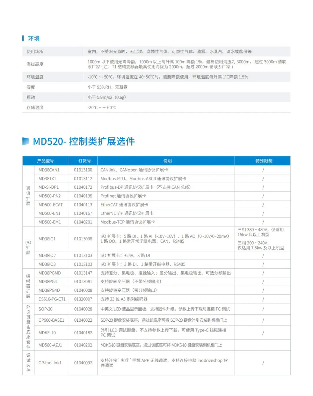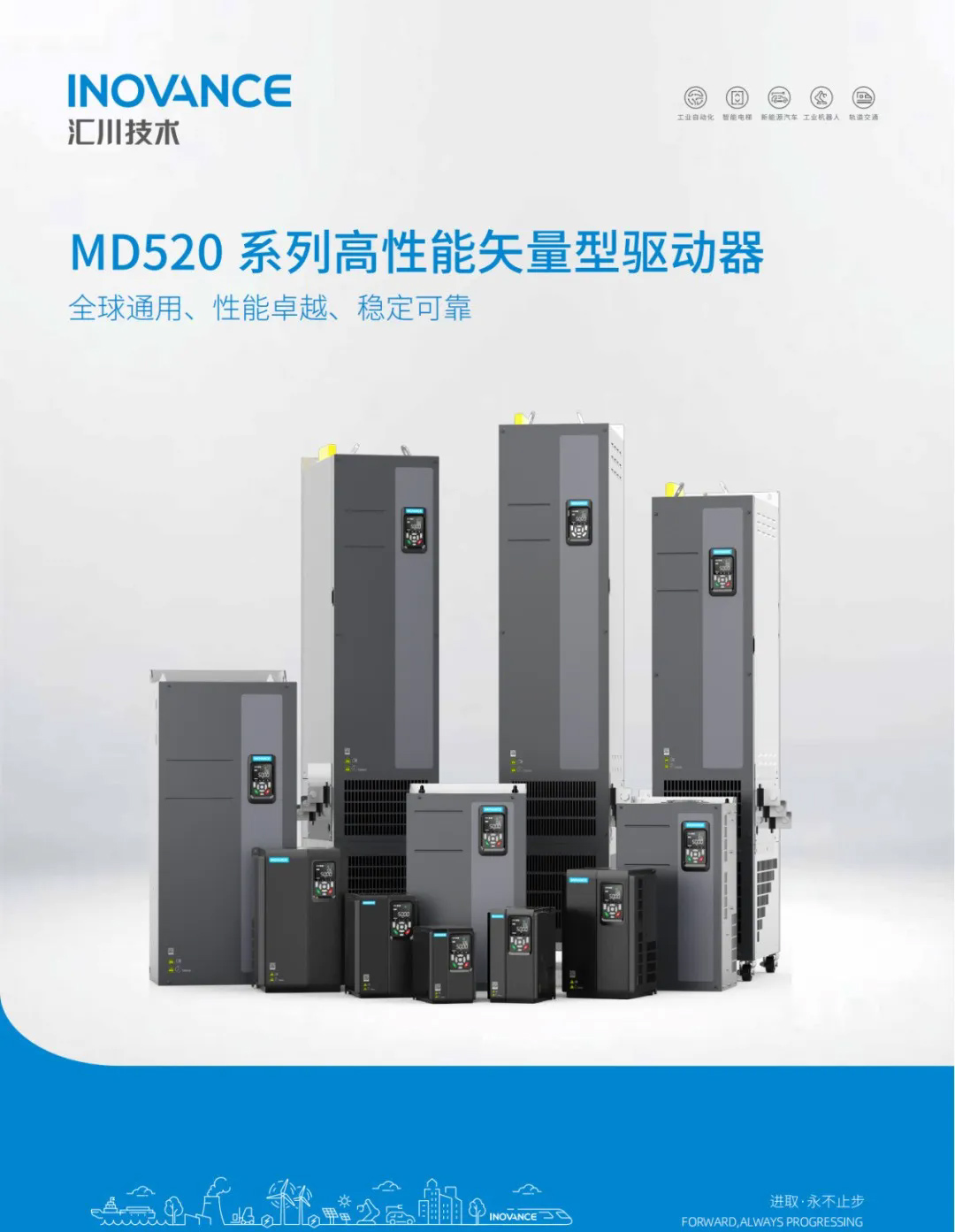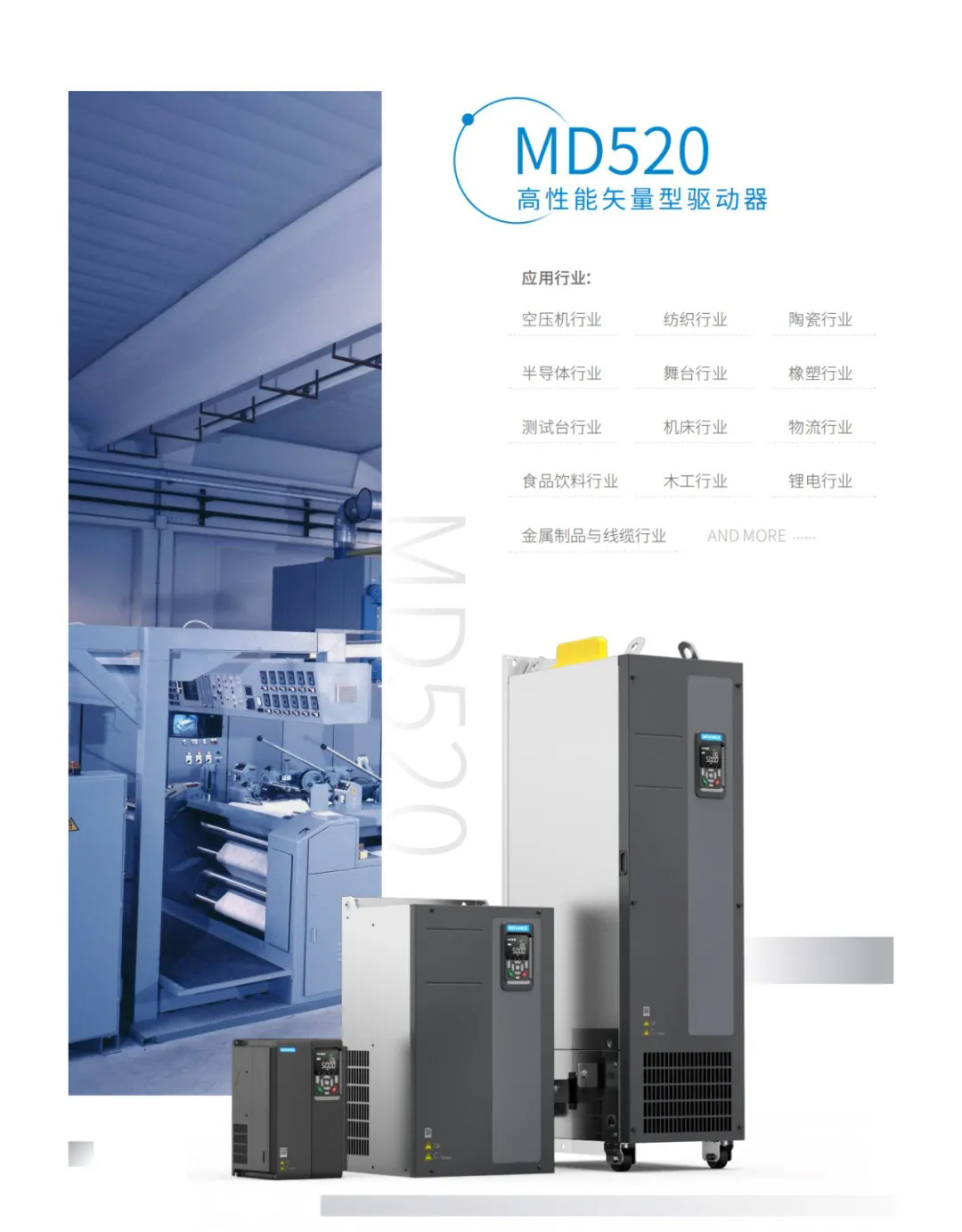 MD520系列變頻器是匯川的一款通用高性能電流矢量變頻器,主要用于控制和調(diào)節(jié)三相交流異步電機(jī)和三相交流永磁電機(jī)的速度和轉(zhuǎn)矩,可用于紡織、造紙、拉絲、機(jī)床、包裝、食品、風(fēng)機(jī)、水泵及其他自動(dòng)化生產(chǎn)設(shè)備的驅(qū)動(dòng)。