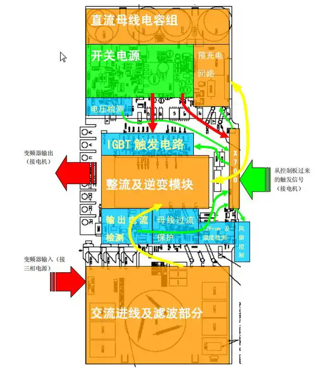 黃線:主回路信號(hào)流向;寬紅線:變頻器輸入輸出電流;寬綠線:來(lái)自控制板的信號(hào); 窄紅線:電源信號(hào); 窄綠線:控制信號(hào)。
