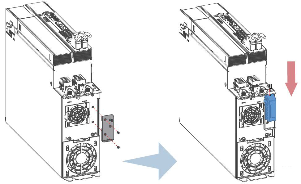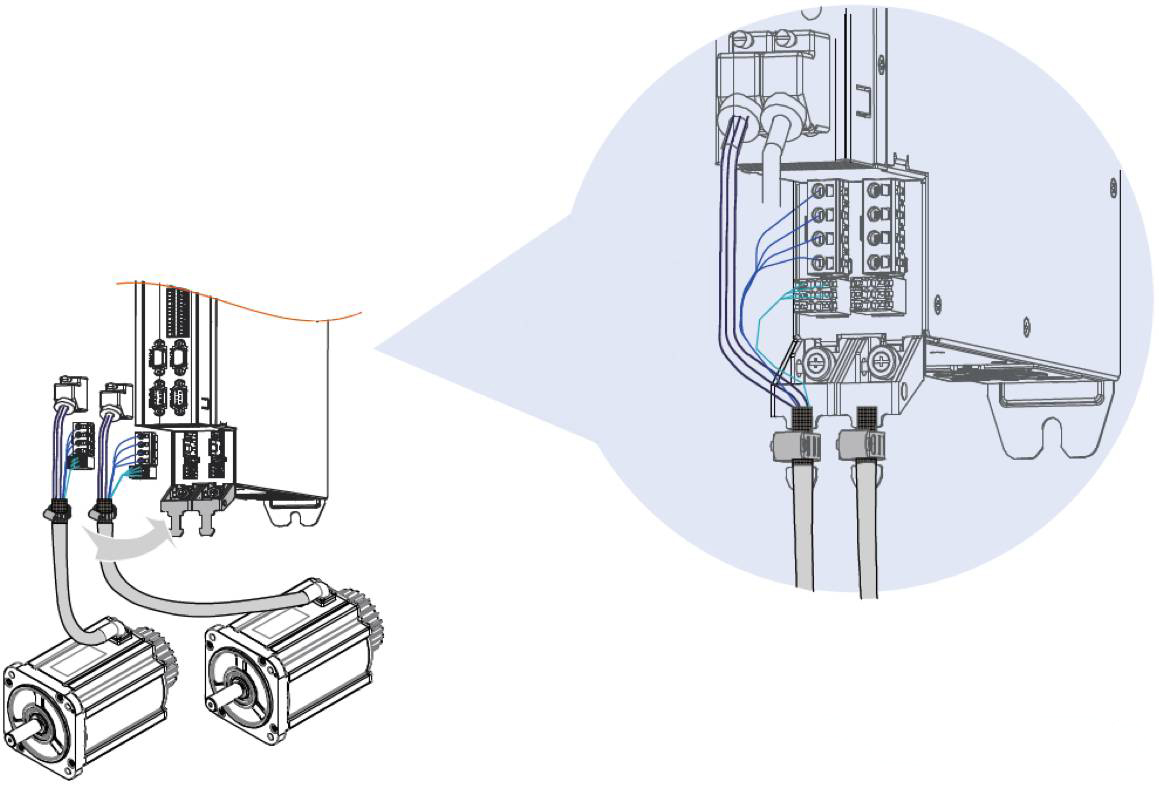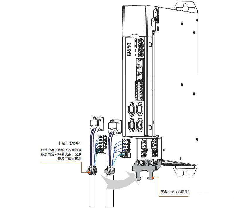 同時(shí)可以注意到,在 IS810N-INT 模塊底部,電機(jī)電纜接入驅(qū)動(dòng)器的進(jìn)線端口下方,有專門(mén)用于線路固定和屏蔽接地的金屬支架,以提升設(shè)備系統(tǒng)的 EMC 電磁兼容性能。