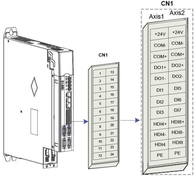 CN5/CN7 上方的 CN1,是驅(qū)動(dòng)器自帶的 24 針 I/O 輸入輸出控制端口,此處共包含: