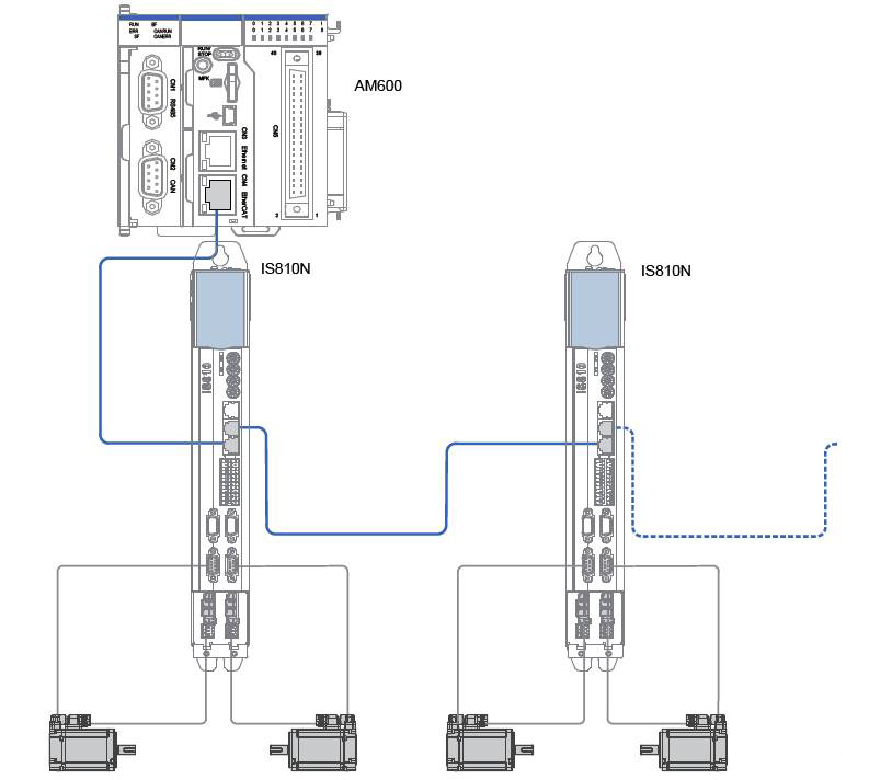 CN3/CN4 為雙 EtherCAT 實(shí)時(shí)運(yùn)控以太網(wǎng)端口,用于將驅(qū)動(dòng)器接入設(shè)備的運(yùn)控系統(tǒng)。而在控制器的使用上,IS810N-INT 的選擇是比較靈活的,不僅可以適配匯川自家的 AM600,還可以兼容包括 Beckhoff 和 Trio 等多個(gè)品牌的 EtherCAT 設(shè)備控制器。