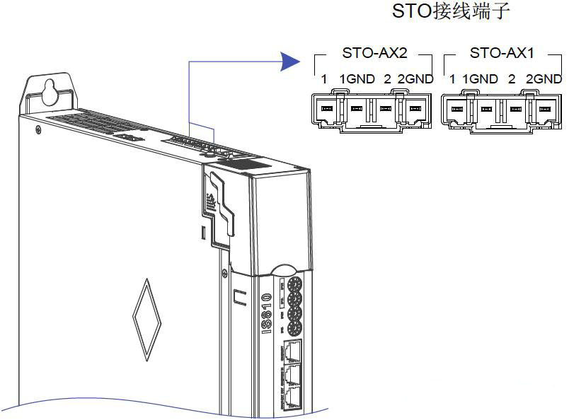 官方發(fā)布的資料顯示,IS810N-INT 還能夠通過(guò)內(nèi)置集成的安全扭矩關(guān)斷功能,實(shí)現(xiàn)一類(CAT 1)運(yùn)動(dòng)安全停止,其 STO 端子位于驅(qū)動(dòng)器頂部中間,靠近雙 RJ45 端口。