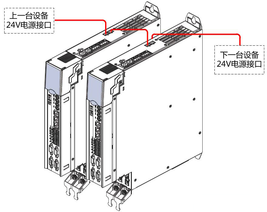 IS810N-INT 將驅(qū)動(dòng)器的 24 VDC 控制電源輸入放在了模塊頂部中間略靠近散熱通風(fēng)口的位置,并且采用了雙端口的設(shè)計(jì)。因此,多臺(tái) IS810N-INT 驅(qū)動(dòng)器的控制電源端口可以通過(guò)首尾相連的跳線跨接方式共同接入一個(gè) 24 VDC 開(kāi)關(guān)電源,這將有助于簡(jiǎn)化多軸伺服驅(qū)動(dòng)系統(tǒng)的線路布局。
