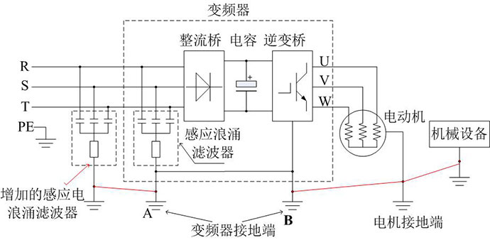 為了避免變頻器電機漏電維修這個問題,變頻器硬件設(shè)計中加入了電感浪涌濾波電路(其等效電路如圖1所示),并將電感浪涌濾波的地側(cè)連接到變頻器的外殼上,同時將變頻器的接線 說明書要求將電機的地線端子與變頻器的地線端子B連接,將輸入電源的地線(即大地)與變頻器的地線端子A連接。