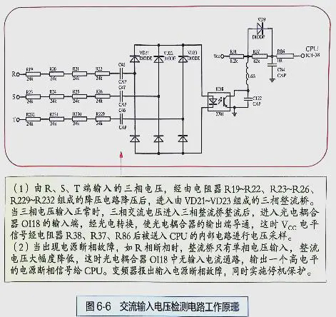 交流輸入電壓檢測電路的核心任務(wù)是監(jiān)測R、S、T端輸入的電源電壓。首先,這些電壓會經(jīng)過電阻器進(jìn)行降壓或限流處理,以確保電路的安全。隨后,這些經(jīng)過處理的電壓會通過橋式整流電路進(jìn)行整流,轉(zhuǎn)化為脈動直流電壓,利用光電耦合器進(jìn)行處理,然后由CPU判斷是否存在缺相情況,確保電路安全。其整個(gè)工作過程如圖所示。