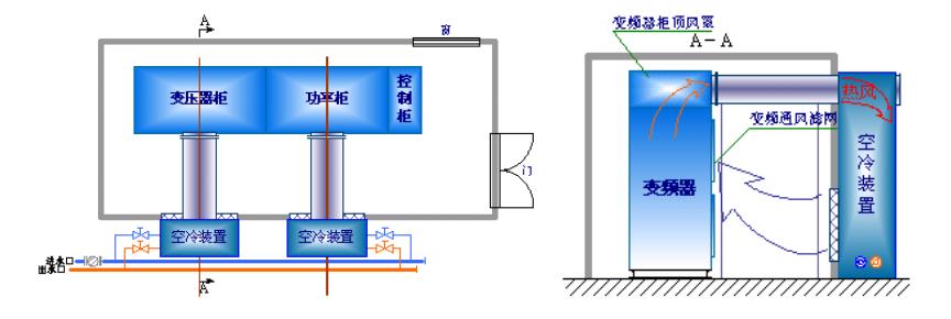 為了提高高壓大功率變頻器的應(yīng)用穩(wěn)定性,解決好高壓變頻器環(huán)境散熱問(wèn)題。目前常用的辦法是:密閉式空調(diào)冷卻。該方法主要是為高壓變頻器提供一個(gè)固定的具有隔熱保溫效果的房間,根據(jù)高壓變頻器的發(fā)熱量和房間面積大小計(jì)算出空調(diào)的制冷量,從而配備一定數(shù)量的空調(diào)。采用空調(diào)冷卻時(shí),房間的建筑面積過(guò)大會(huì)增加空調(diào)冷卻負(fù)荷。同時(shí),由于變頻器排出的熱風(fēng)不能被空調(diào)全部吸入冷卻,因此,造成系統(tǒng)運(yùn)行效率低,造成節(jié)約能源的二次浪費(fèi)。變頻器室內(nèi)的冷熱風(fēng)循環(huán)情況如下圖所示。