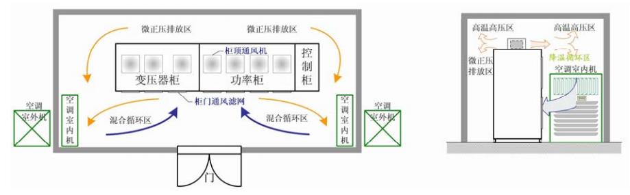 為了提高高壓大功率變頻器的應(yīng)用穩(wěn)定性,解決好高壓變頻器環(huán)境散熱問題。目前常用的辦法是:密閉式空調(diào)冷卻。該方法主要是為高壓變頻器提供一個固定的具有隔熱保溫效果的房間,根據(jù)高壓變頻器的發(fā)熱量和房間面積大小計算出空調(diào)的制冷量,從而配備一定數(shù)量的空調(diào)。采用空調(diào)冷卻時,房間的建筑面積過大會增加空調(diào)冷卻負荷。同時,由于變頻器排出的熱風(fēng)不能被空調(diào)全部吸入冷卻,因此,造成系統(tǒng)運行效率低,造成節(jié)約能源的二次浪費。變頻器室內(nèi)的冷熱風(fēng)循環(huán)情況如下圖所示。