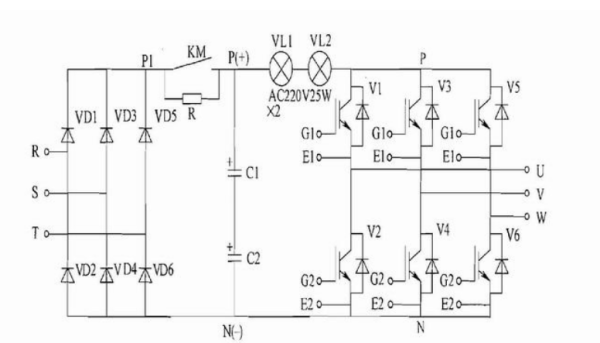 上電與運行燈泡都不亮,測量三相輸出的電壓不平衡,那就說明某相IGBT內部開路,造成導通內阻增大,接近開路狀態(tài)。