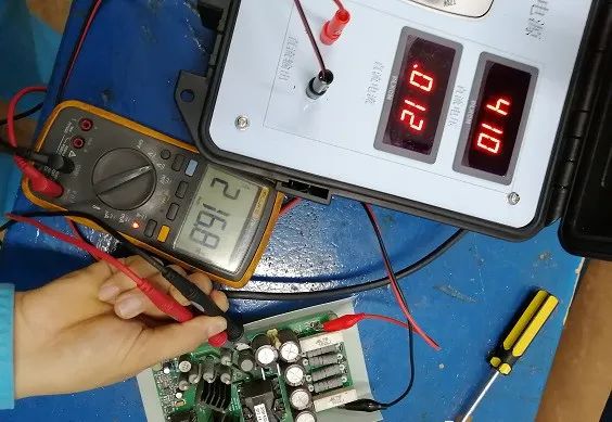 接頭來(lái)連接電源,正負(fù)極線柱之間的距離較小,帶壓測(cè)量時(shí)很容易短路,測(cè)量時(shí)盡量使用帶鱷魚線夾的表筆,加壓前先把表筆夾好,推薦采用下圖測(cè)量方式。