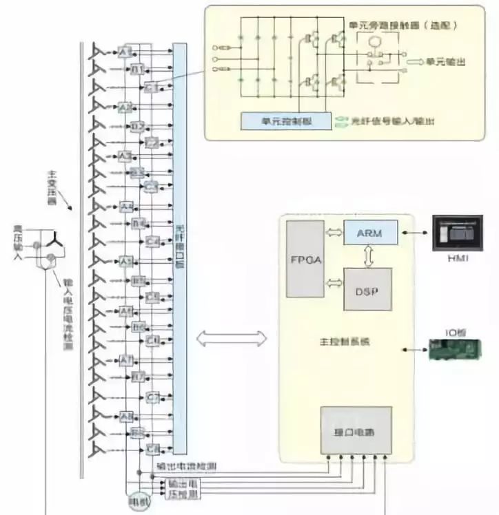功率單元采用三相交流輸入,整流濾波后形成直流電壓,經(jīng)IGBT H橋逆變后輸出脈寬調(diào)制(PWM)電壓。功率單元控制板由IGBT驅(qū)動電路和監(jiān)測保護電路、光纖通信電路、單元旁路電路和控制電源組成。運行中功率單元故障時,變頻器可將故障單元自動旁路并繼續(xù)運行,等情況允許時再停機排除故障。