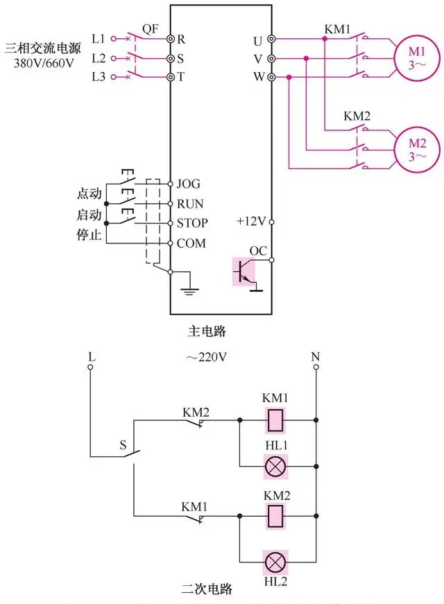 按下二次電路中的SB1、 SB3則M1、 M2停止運(yùn)行。