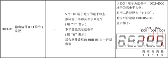 3、H0B-05,可以監(jiān)控DO狀態(tài),比如DO1用了抱閘輸出這個功能,若使能的情況下,抱閘應該松開,若仍然抱住,就可以通過看H0B-05的高低電平來判斷DO輸出是否正常,使能情況下,理論上D01應該是低電平;